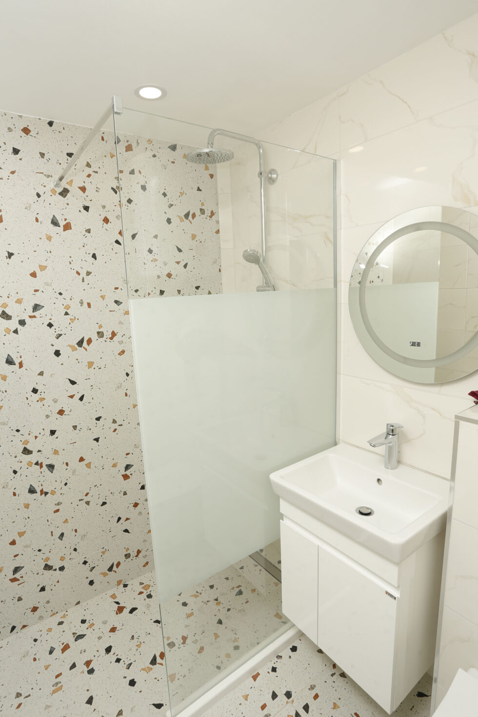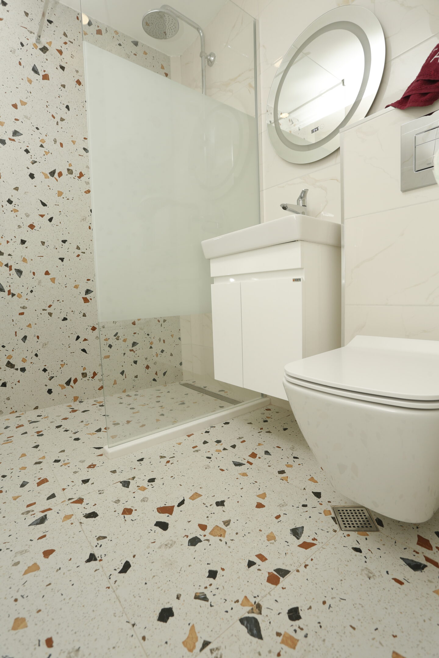 „TERRAZZO“ e интериорно решение, в което геометрията на модерното се среща с текстурата на класиката. Терацо стените и подът придават характер и изразителност, а изчистените линии на обзавеждането подчертават усещането за простор и лекота.
